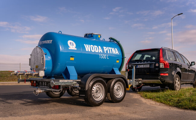 Nowa przyczepa MEPROZET umożliwia szybki transport i dystrybucję wody pitnej — pojemność 1500 l, atest PZH i kompletne wyposażenie.